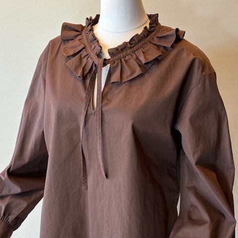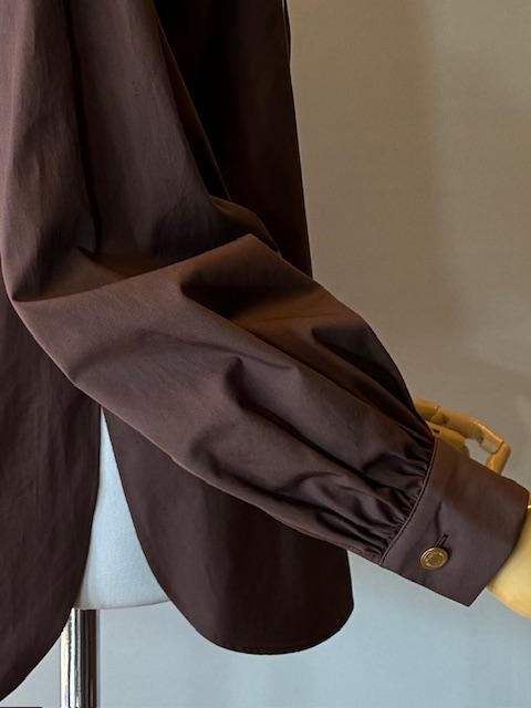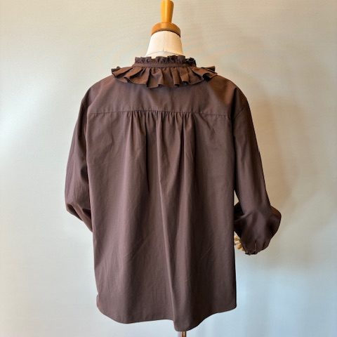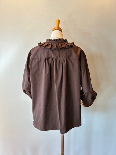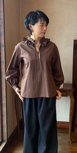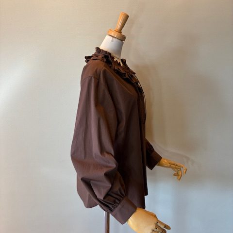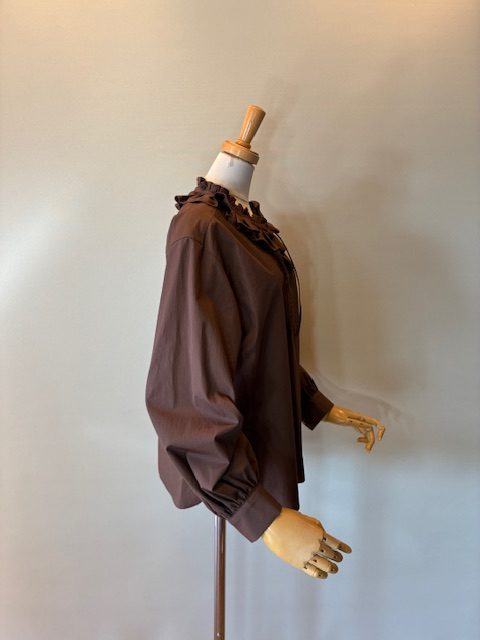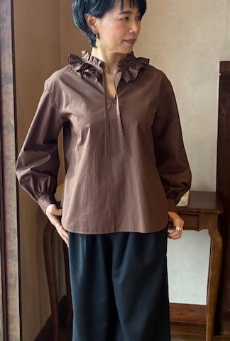 ソフトな質感が特徴のコットンモールスキン素材を使用したブラウス。しっかりとした肉感素材で、秋冬~春と長いシーズン活躍します。立体的なラッフルカラーがポイントで、袖口には2WAYのカフスボタンを配し、さりげないポイントに。 コットン100%