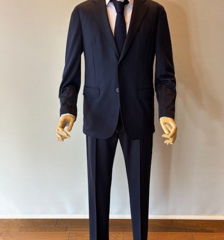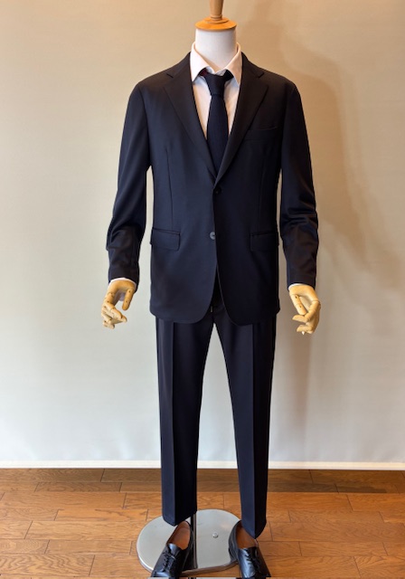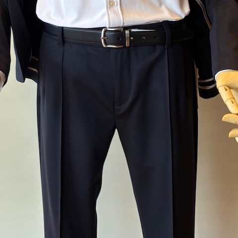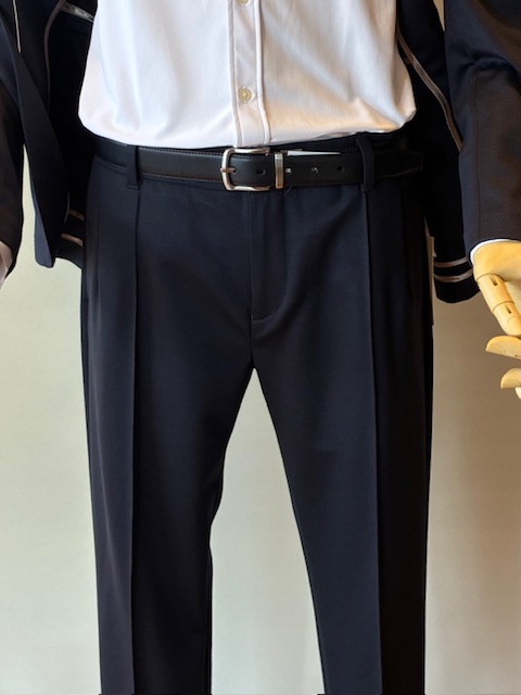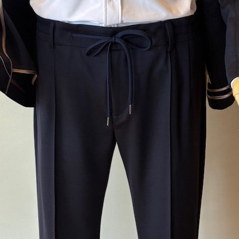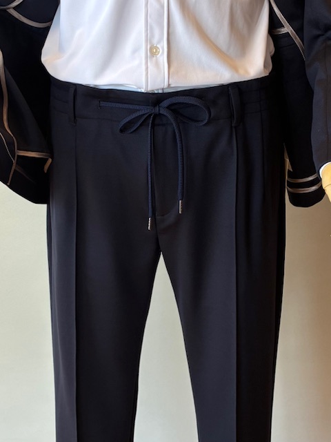 ウール混合の高密度なジャージー素材。伸縮性とキックバック性を併せ持ち、リッチな光沢感、防シワ性が魅力です。袖口は本切羽仕様、パンツはピンタック入りで常に美しいシルエットをキープします。タイドアップはもちろん、Tシャツにスニーカースタイルもおすすめです。セットアップパンツ¥31,900 ウール65% ポリエステル35%