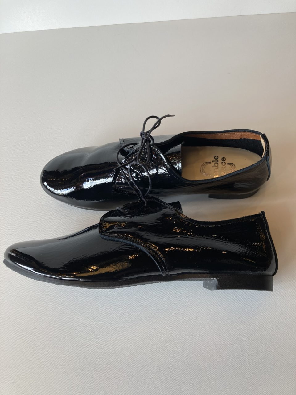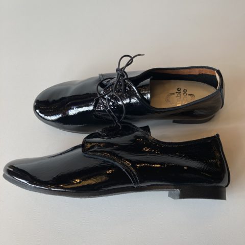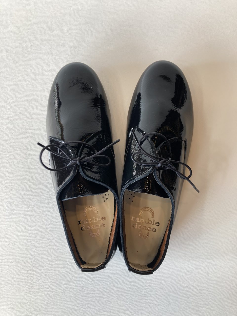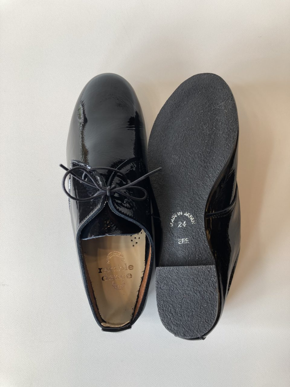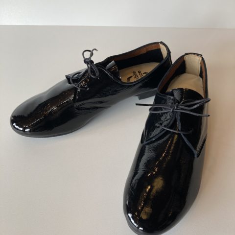 当店で人気のramble danceのレースアップシューズにエナメル加工を施しています。デイリーユースのレザースニーカー的なバレーシューズをイメージしたアイテム。コロンとした丸みのあるラウンドトゥと柔らかな曲線のフォルムは、コーディネイトを選ばずに履いていただけます。