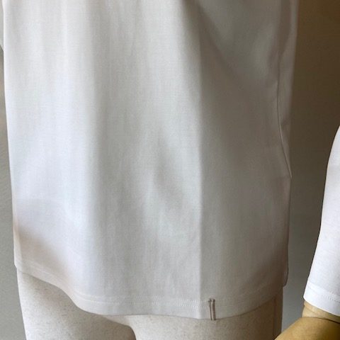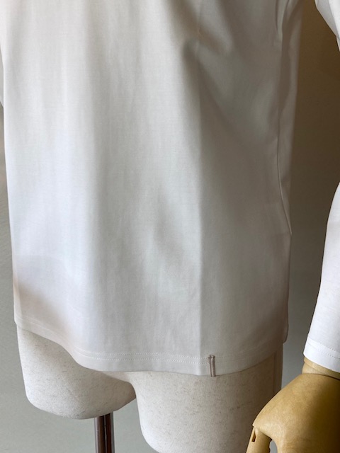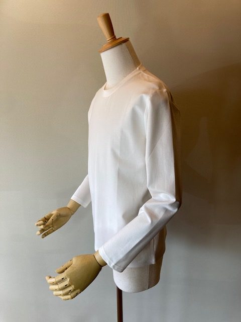 レーヨンナイロンにポリウレタンを混紡させ、微光沢感と柔らかさを生み出しています。きめ細かな素材感とミディアムウエイトで透けにくく、レイヤードにはもちろん、一枚でも戦力になるTシャツです。 レーヨン65% ナイロン27% ポリウレタン8%