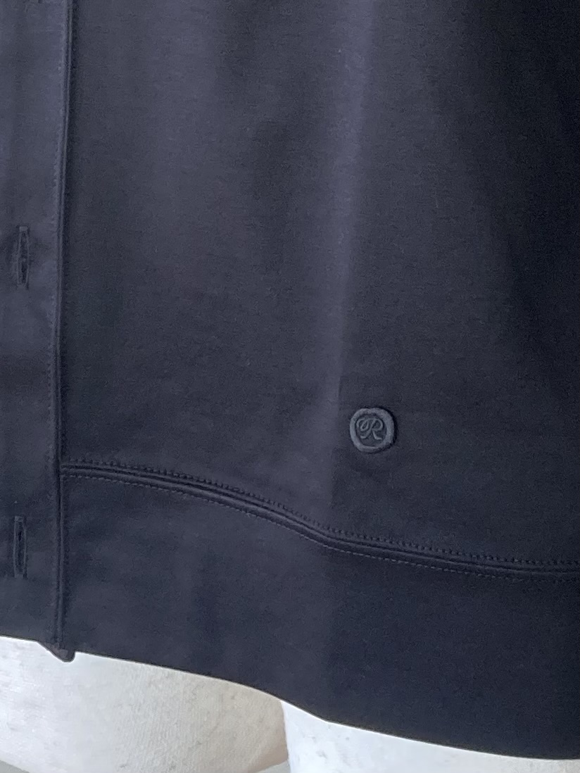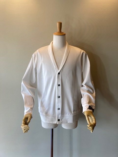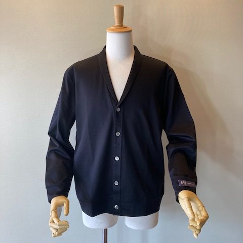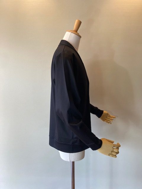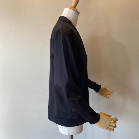 名古屋で100年以上の歴史を持つ近藤紡績所で生産された素材を使用しています。滑らかな肌触りと伸縮性に優れたコットンフライス素材は、吸湿性、通気性があり型崩れしにくいのが特徴です。小ぶりなショールカラーで、きちんと感とリラックス感を併せ持ちます。 コットン100%