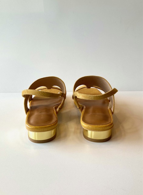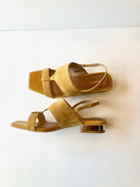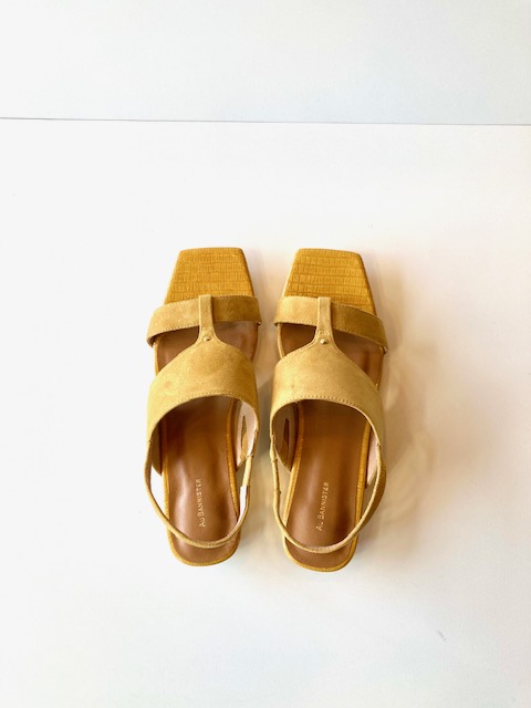 型押しリザードとスウェードのコンビ使いがエキゾチックな雰囲気のサンダル。ソールの形状による安定感のある履き心地と高級感のあるデザインが魅力で、メタリックゴールドのヒールが上品なアクセントに。 ヒール約3.5cm 羊革
