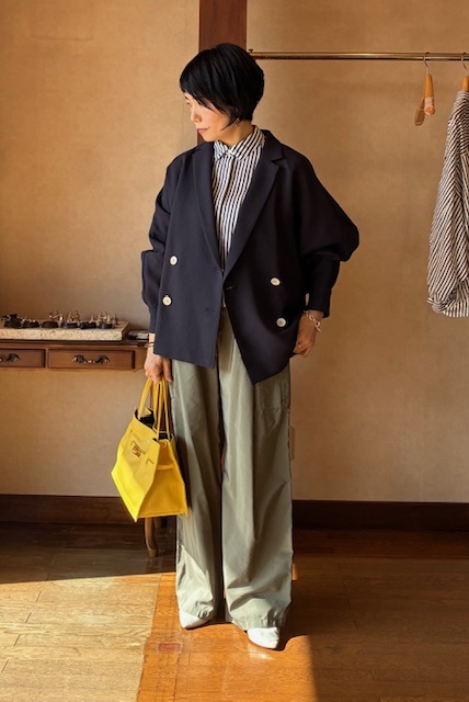 ネイビージャケットにロンドンストライプシャツというトラッドテイストなスタイル。ですが、一点一点のアイテムを見れば一捻りを加えたデザインばかり。落ち感のある素材のカーゴパンツで抜け感をプラス。