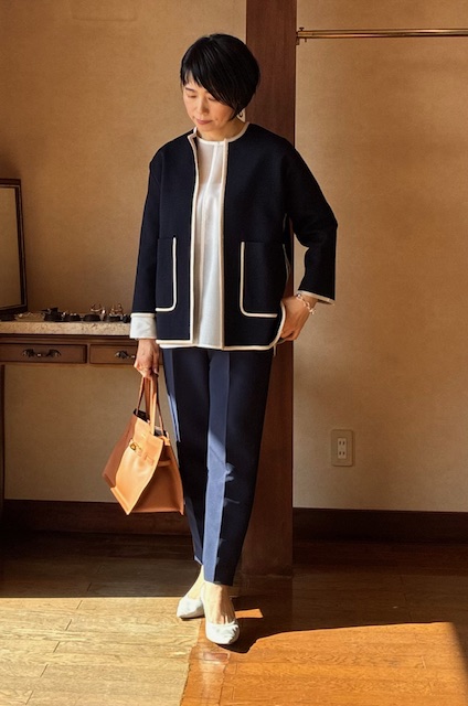ノーカラーのショートジャケットは、オケージョンからカジュアルまで幅広く使えて、合わせるボトムを選ばない万能アイテム。優しいカラーのレイヤードがちょっと早い春っぽさを感じさせます。