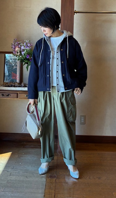Gジャンプラスフーディ、そしてカーゴパンツというカジュアル度満載ですが、それぞれを軽量かつ上質なアイテムでまとめた大人カジュアルスタイル。スニーカーではなくパンプスでバランスを取って。